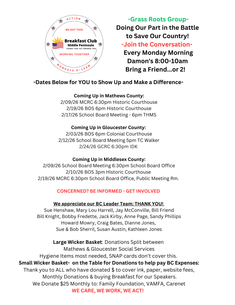 June 2nd, 2025 Mid Pen Breakfast Club was the first of our Mini-Town Halls featuring local Candidates. Shannon Hanson, Glouc. BOS; Kellie Lockerby, Mathews SB and Mike Walls, Mathews BOS spoke to us. Even though we are a Christian Conservative Action Group, things did get a little out of hand. We have Guest Speakers to communicate, listen, learn and possibly help situations if we can. We want to hear values & goals for our Counties. There will be no more angry statements or personal accusations permitted. If you plan to personally attack anyone or know you can’t control yourself…please stay home. Enough said. Any questions, please contact me. Jean 804-815-2839